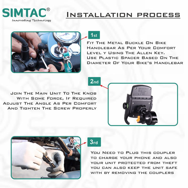 Anti theft Security :Why worry about your mobile holder when you can carry it along with you by not leaving it on your parked vehicle. If you want to protect your mobile holder from any kind of theft/robbery , then Simtac Mobile Holder is the top of the line in protection with our easy plug to remove the mobile holder and keep the wire intact in the bike for preventing mobile holder from theft.